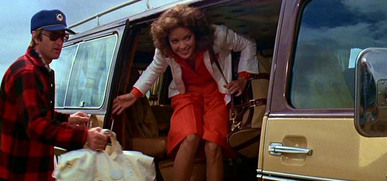 Waiting on the runway for his private jet to pick him up, Flash spots Dale Arden (Melody Anderson), a brunette travel agent, getting out of a van. Judging by the way their eyes lock, it's obvious that Flash and Dale are attracted to one another. And why wouldn't they be? He's tall, handsome, and is wearing a white t-shirt with his name on it (his first name is emblazoned across his chest in flamboyant red letting). And she, well, she's rocking a red and white ensemble like nobody's business; a pair of cheeky white pumps, a modest red dress, and a white blazer with a red handkerchief in the pocket. In other words, Flash likey.
