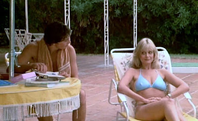 Kitten Natividad and Graem McGavin over the course of the two subsequent nights, Bobby is clearly itching for some poontang. Don't be crude. Uh, I mean, Bobby currently possesses a profound desire to experience a raucous bout of tasteful coitus with a willing member of the opposite sex. And you know who's a member of the opposite sex? That's right, Terry Green. And just like her interview with Mr. Chrystal, Terry induces hardness via the sight of her legs crossed. Except, instead of deploying them in a stuffy office with the aid of a modest white dress, Terry unleashes her gams pool side with the backing of a pair of pink shorts. The sight of her legs crossed causes Bobby, in a veiled attempt to cool off his inflamed genitals, to jump in the pool.
