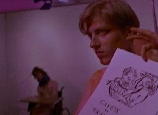 Awkwardly gesturing toward some curtains, Christine introduces us to "fantasy theatre," a sort of Café Flesh-esque nightclub where unorthodox sex scenarios are acted out for the amusement of the saps in the audience. The one we're shown involves three sailors, who seem to be working on what looked like a submarine engine. Bathed in smoke and illuminated with this eerie pink light, the sailors are interrupted by three ladies in lingerie (one of which was definitely Nikki, the douche girl). Anyway, the weirdly edited (some moments are repeated multiple times) scene goes on for about eight minutes.